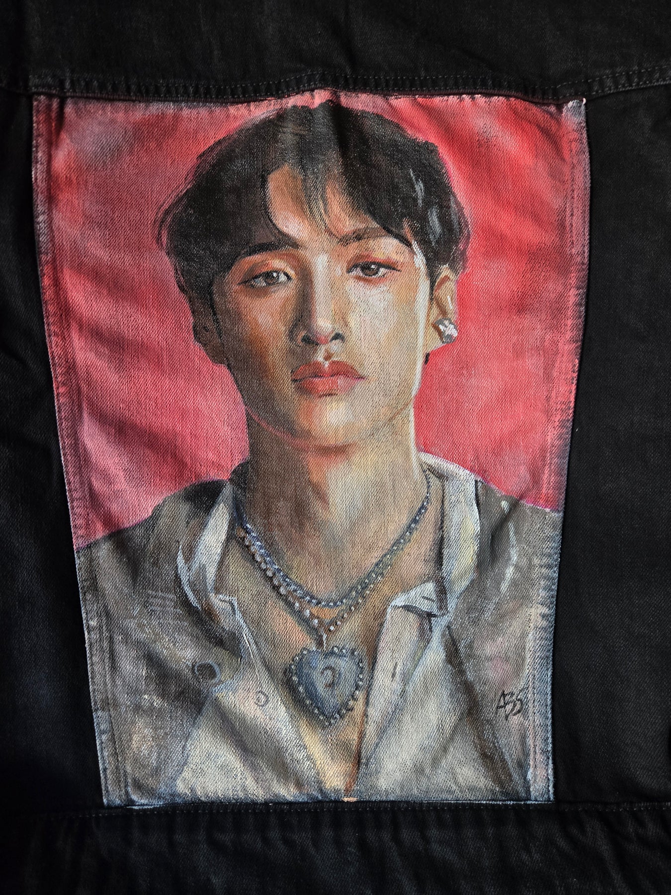 This hand-painted denim jacket captures his commanding presence with vibrant airbrush artistry. The portrait features his signature heart necklace, a nod to the style and charisma that fans love. From his sharp leadership on stage to the charm in every Stray Kids performance, Bang Chan’s personality comes alive on this wearable canvas.