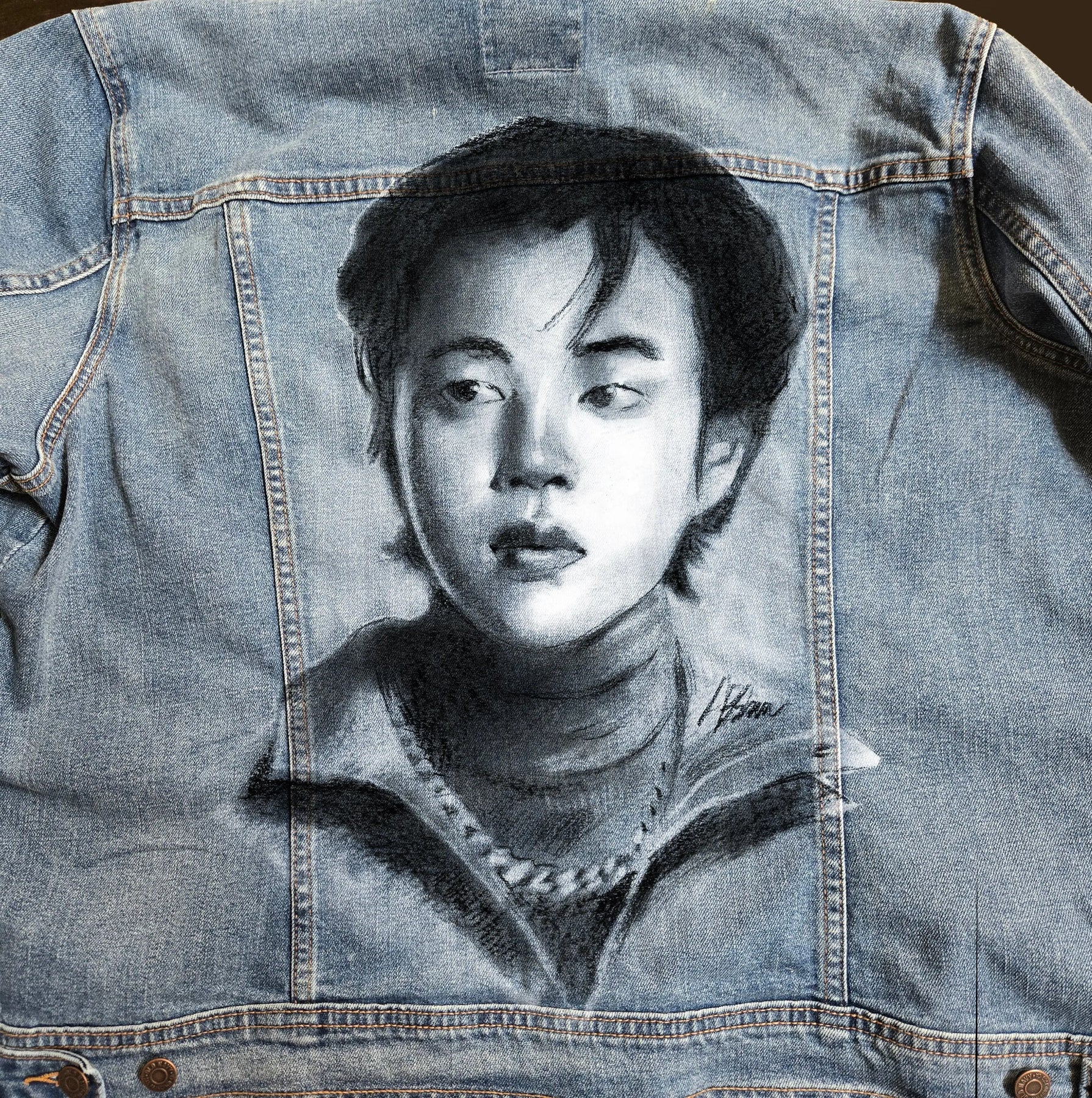 This Jimin BTS airbrushed denim jacket is rendered in a charcoal-inspired style that captures movement, emotion, and quiet vulnerability. The monochrome portrait leans into softness and shadow, reflecting Jimin’s expressive presence and the fluid grace that defines his artistry.